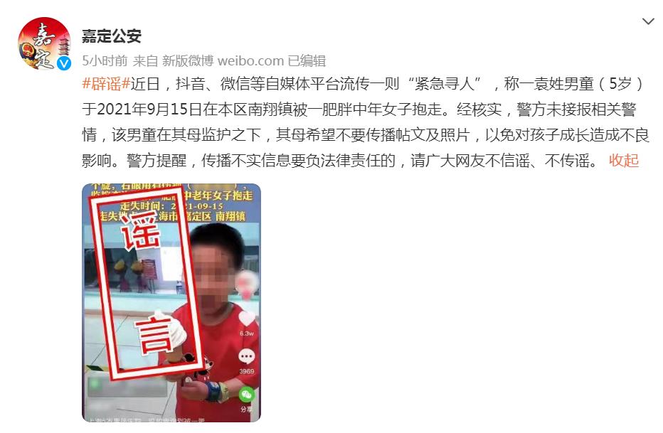 近日,抖音、微信等自媒体平台流传着一则“紧急寻人”启事,称一袁姓男童(5岁)于2021年9月15日在上海市嘉定区南翔镇被一肥胖中老年女子抱走。