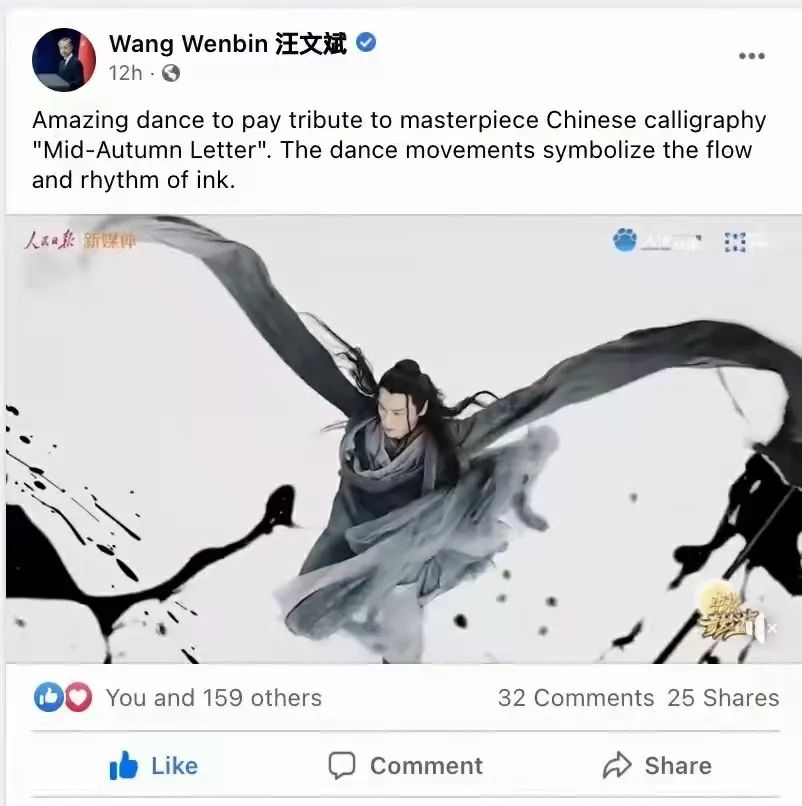 21日晚,中国外交部新闻发言人汪文斌向全球推介《中秋奇妙游》。汪文斌发文称:一曲惊艳舞蹈来向中国书法代表作《中秋帖》致敬,舞蹈动作象征着水墨的流动和节奏。