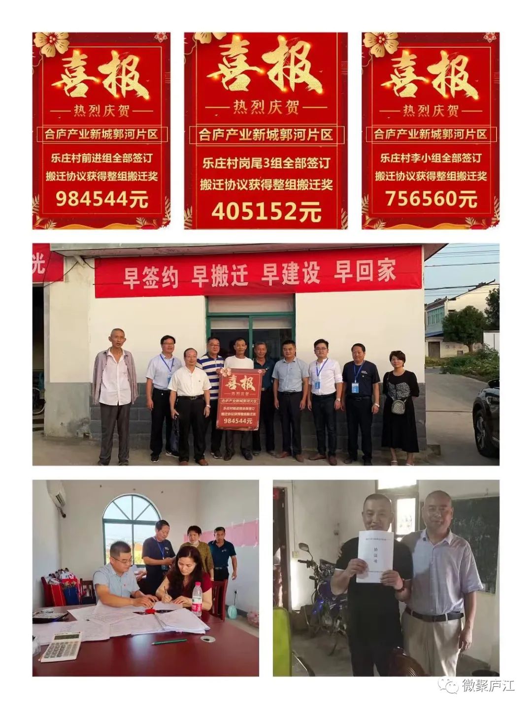 乡镇(园区)动态中秋节假日期间,郭河镇广大镇村干部放弃与家人团聚的机会,坚守合庐产业新城郭河片区搬迁安置工作一线,积极开展集中签约工作。继9月20日郭河社区小庄村民组获得整组搬迁奖488320元后,9月21日乐庄村前进组、岗尾3组、李小组再接再厉,全部签订搬迁协议,分别获得整组搬迁奖984544、405152、756560元。