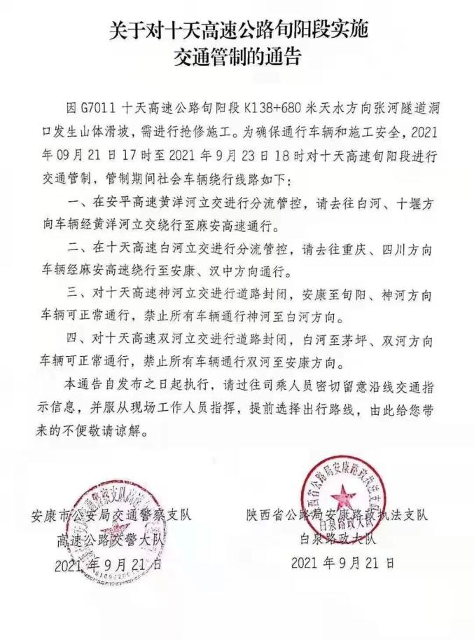 三、对十天高速神河立交进行道路封闭,安康至旬阳、神河方向车辆可正常通行,禁止所有车辆通行神河至白河方向。