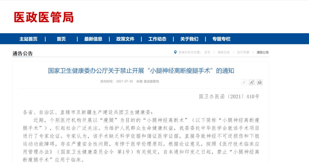 7月30日国家卫健委也发布了一项通知,禁止开展“小腿神经离断瘦腿手术”。