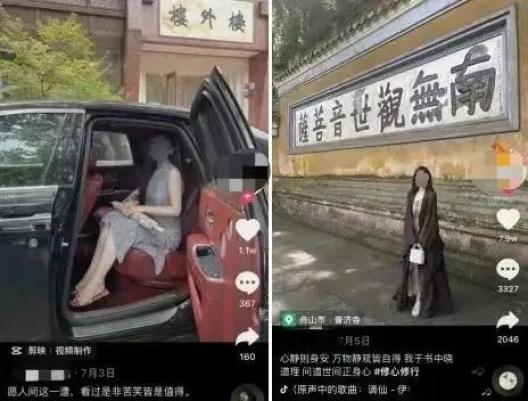 一名“佛媛”在社交账号上的生活是这样:在豪宅里起床喝个早茶,抱着大牌包包打坐修行,抄经焚香叩拜,打玻尿酸塑造佛相,穿开衩袈裟吊带佛衣,逢年过节开着跑车上山进香,时不时分享哪个寺庙最出片儿,每条视频都得写一些“佛言佛语”烘托清静无为的气氛。