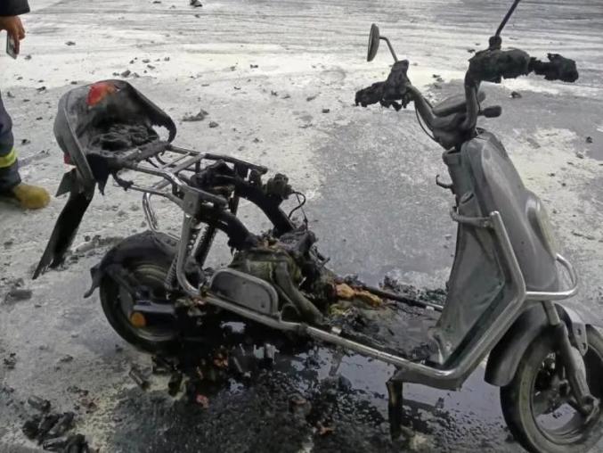据王女士介绍,消防很快到达现场将火扑灭,地上残留了大量白色泡沫,起火的电动车被烧得仅剩车架,所幸未造成人员伤亡。