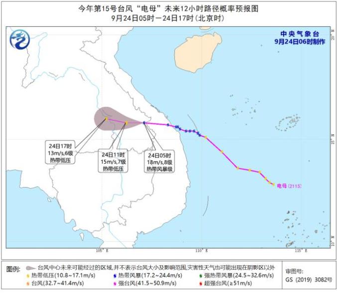 昨晚17时,南海热带低压加强为今年第15号台风“电母”(热带风暴级;英文名称:Dianmu;名字来源:中国;名称意义:神话中的雷电之神)。“电母”已于今天(24日)凌晨1点30分前后在越南中部广南省沿海登陆,登陆时中心附近最大风力有8级(18米/秒),今天5点钟其中心位于老挝南部公河省境内,中心附近最大风力有8级(18米/秒),预计,“电母”将以每小时15-20公里的速度向偏西方向移动,强度逐渐减弱。由于“电母”对我国近海的影响趋于减小,中央气象台今天6时解除台风蓝色预警。