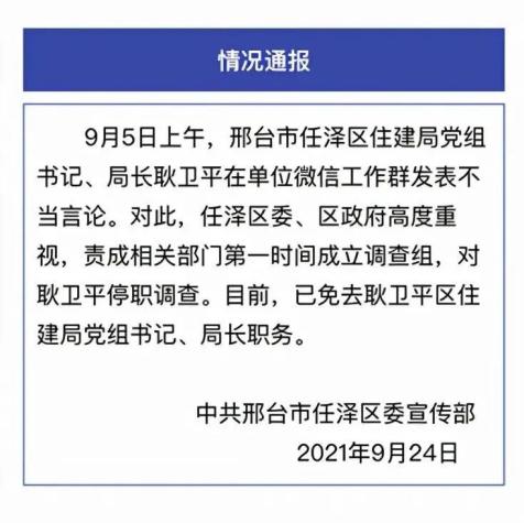 24日,邢台任泽区委宣传部发出官方通报:9月5日上午,邢台市任泽区住建局党组书记、局长耿卫平在单位微信工作群发表不当言论。
