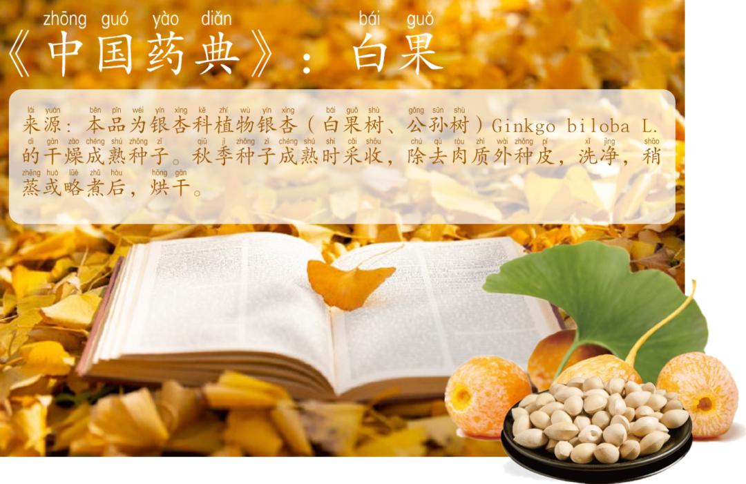 【药理作用】1)白果肉、白果汁、白果酚,尤其是白果酸体外试验时对人型结核杆菌和牛型结核杆菌有抑制作用;2)白果乙醇提取物可使呼吸道酚红排泌增加,似有祛痰作用,且对离体豚鼠气管平滑肌表现有微弱的松弛作用;3)白果二酚可使毛细血管的通透性增加,有短暂的降压作用;4)银杏外种皮水溶性成分能清除在有氧存在下黄嘌呤氧化酶系统产生的超氧自由基,抑制化学发光;5)白果酚甲,对离休兔肠有麻痹作用,使离体子宫收缩,对蛙心无影响;6)白果肉尚有收敛作用,等等【毒理作用】有谓白果仁中提得一种中性结晶成分,对小白鼠有致惊厥作用,后来实验未能证实含有此种物质,对动物大量饲以白果,亦未获得任何特殊的中毒现象。有谓外种皮中含有引起皮炎的银杏毒(Ginkgotoxin),与斑蝥素类似。非洲人榨果汁后,往往引起皮肤刺激症状如脱皮、触痛,口服产生强烈胃肠道刺激。