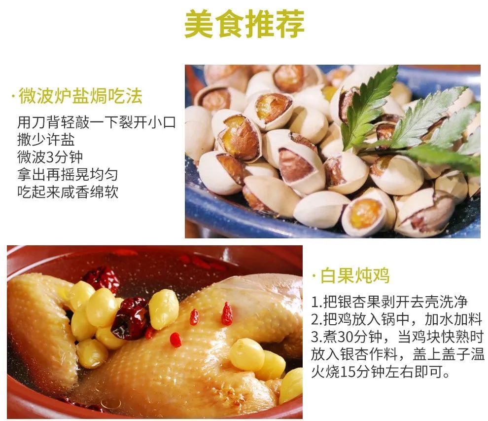 在生活中,盐焗白果、碳烤白果都是开胃的佐餐小吃,既美味又营养。如《本草便读》云其:上敛肺金除咳逆,下行湿浊化痰涎。《本草再新》曰:补气养心,益肾滋阴,止咳除烦,生肌长肉,排脓拔毒,消疮疥疽瘤等等,虽然药食两用,但大多数人对其药理毒理并不清楚,如果盲目食用,容易中毒,危害可不小,所以食用时注意烹饪方式和时间以及适量使用。