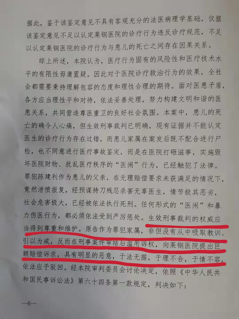 一审判决书共7页,其中第6页先是提到医患矛盾的正确处理态度,继而指出患儿家属的不配合行为和陈建利的犯罪行为,尤其指出“生效刑事裁判的权威应该得到尊重和维护。原告作为罪犯家属,非但没有从中吸取教训、引以为戒,反而在刑事案件审结后滥用诉权,向莱钢医院提出巨额赔偿请求,具有明显的恶意,于法无据,于理不合,于情不容,依法应予驳回。”判决书落款,审判长张信林为钢城区法院党组书记、院长,审判员刘峰为钢城区法院副院长。