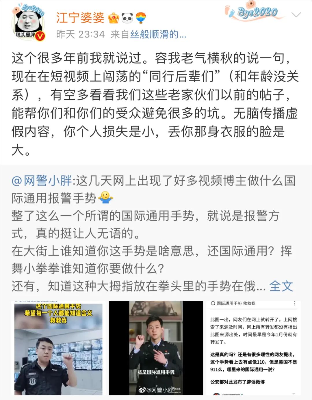 昨天,沈阳网警巡查执法团队负责人微博@网警小胖 转发了相关帖子后无奈表示,“整了这么一个所谓的国际通用手势,就说是报警方式,真的挺让人无语的。普通网民不明就里跟风做这个,我们还可以理解,但是,警方账号也跟风做?是不是有些说不过去了!”