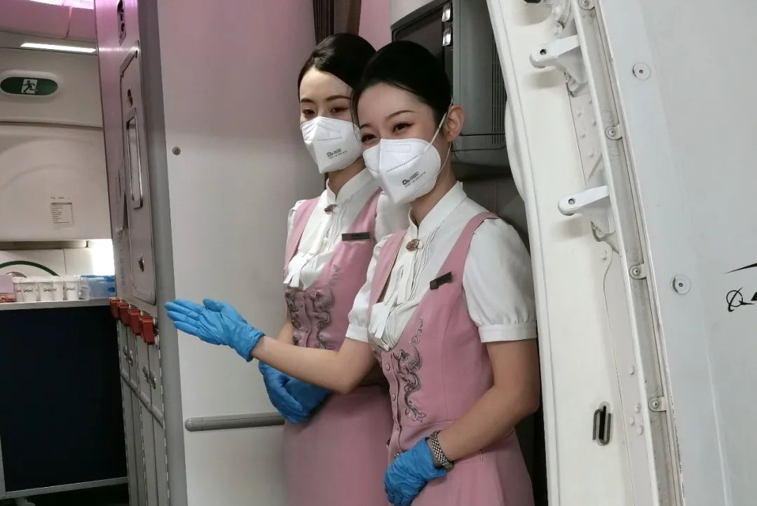 吉祥航空乘务员迎接旅客登上纪念航班(记者钱擘/摄)