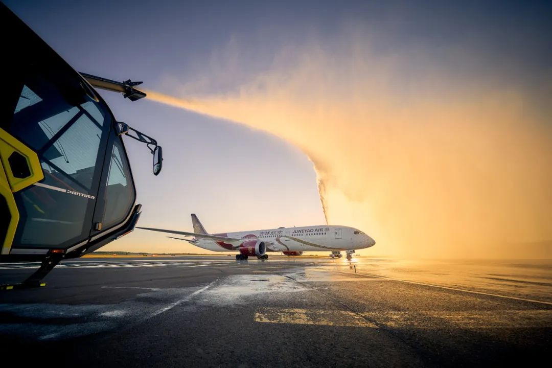 吉祥航空“上海—赫尔辛基”首航航班飞抵赫尔辛基,受到当地水门欢迎。