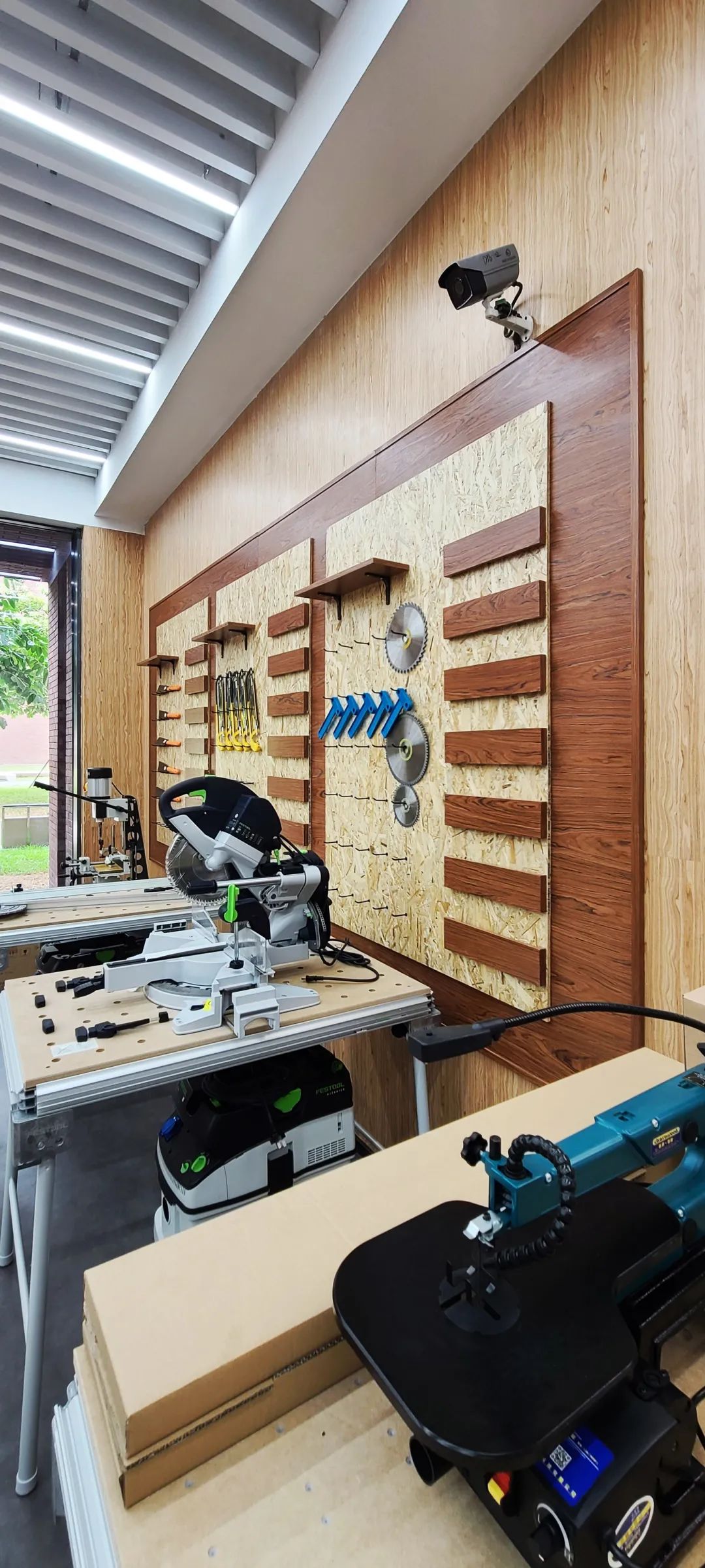 果壳工坊空间主题一划为三,分别是头脑风暴区、木工制作区、作品展示区。