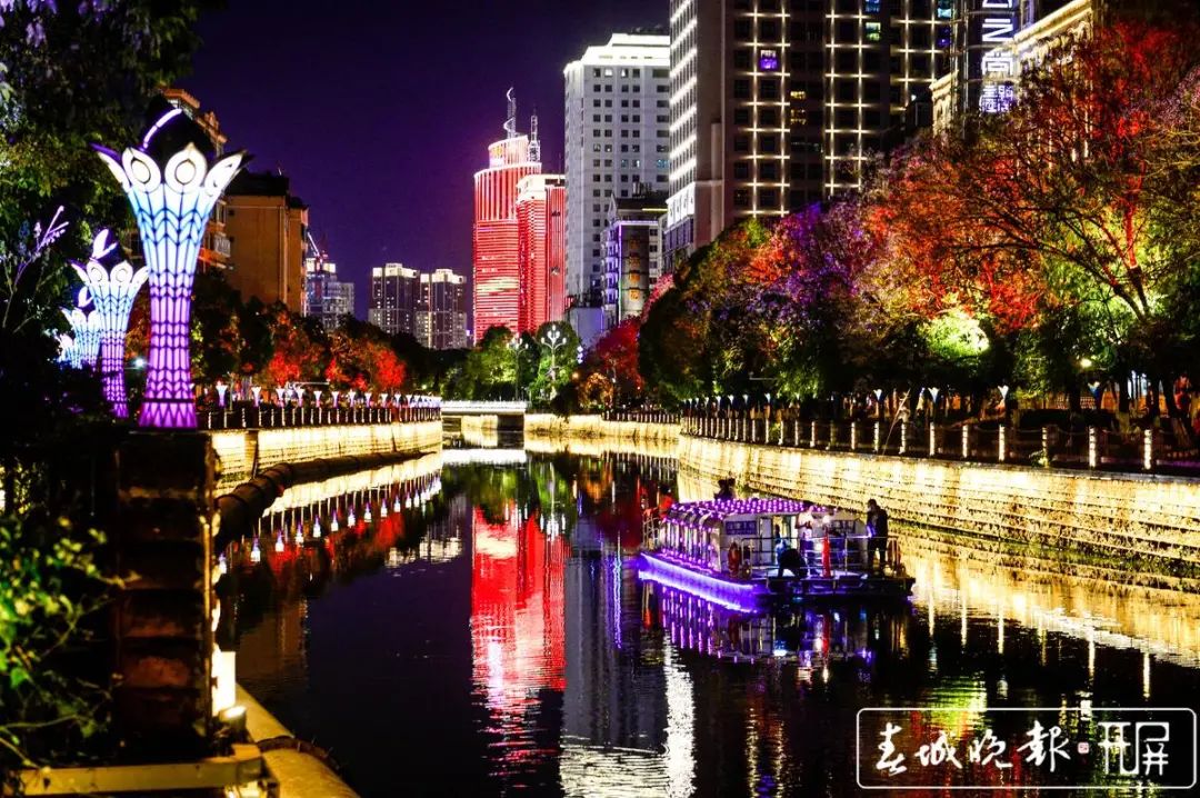 灯光秀以商业圈高楼为主导、温德姆大酒店、阳光酒店、南亚风情、滇池时代4座高楼为组团,以怡心桥、采莲桥的水韵灯光为互动,充分体现了商业圈氛围。