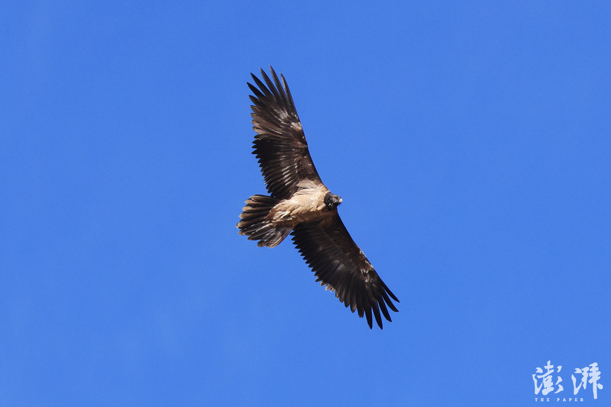 忽然,我注意到附近还有一只头部黑色的大型猛禽在飞,拍下来一看,却完全不认识,凭感觉也是兀鹫的一种。事后才确认是胡兀鹫(我拍到的是亚成鸟,故头部黑色,成鸟的头部为黄白色),那可是国家一级保护动物,“国宝”级的鸟类。