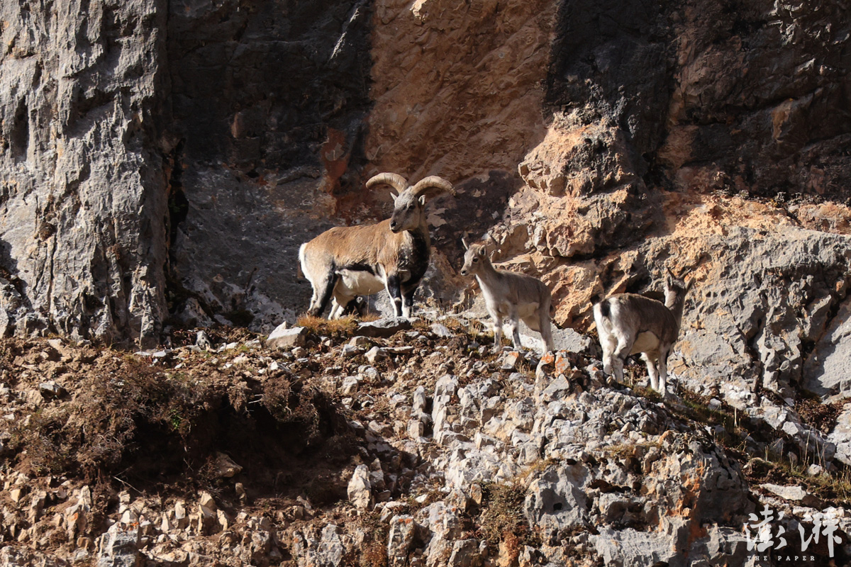 “哪儿哪儿?我怎么没看到!”可能是我太着急了,过了好一会儿才看到这一群岩羊。岩羊是国家二级保护动物,在当地比较多见,它们可以在陡峭的山坡乃至悬崖上如履平地。不过,它们的保护色实在是好,几乎与山岩、灌木融为一体,如果它们不走动的话,可真难发现它们。
