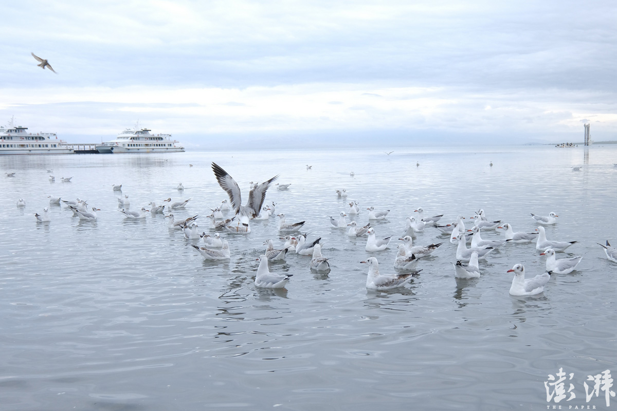 有一道堤,通往湖中的游船码头。刚上堤,就看到湖边一阵喧哗,原来是一大群鸥在争抢游客投喂的食物。其实,给野鸟随意投食,并不是合适的行为。鸟类如果吃多了高油高糖的饼干,会引起身体不适。