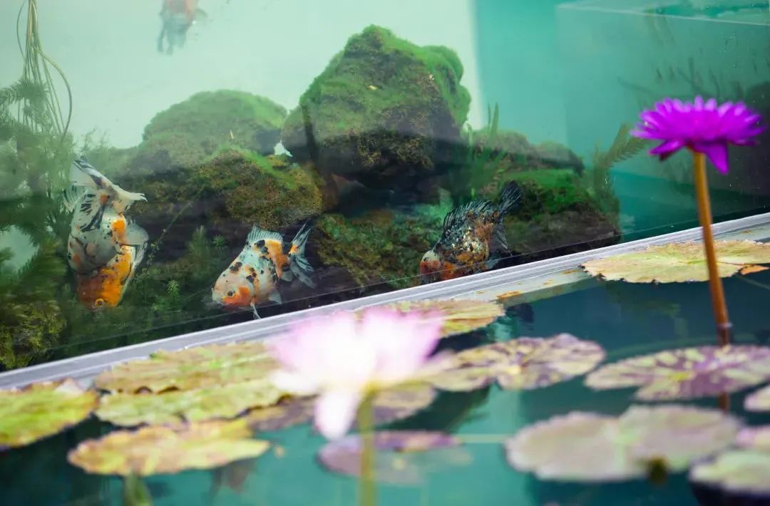 每一组展示的睡莲缸中有了一个透明的鱼缸,除了展示鱼外还能展示睡莲的根部以及水中茎叶的生长情况,让游客全方位的欣赏睡莲和金鱼的美。同时因为有了鱼缸,整个展示更有通透感。有动有静,相互映衬更显水中花的美。素材来源:辰山植物园