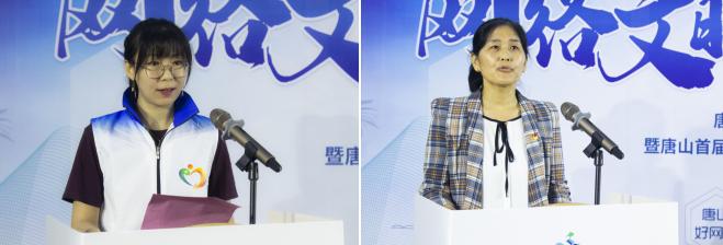 ▲网络文明志愿者代表宣读《唐山市网络文明志愿者倡议书》(左);互联网行业企业代表宣读《唐山市网络诚信倡议书》(右)