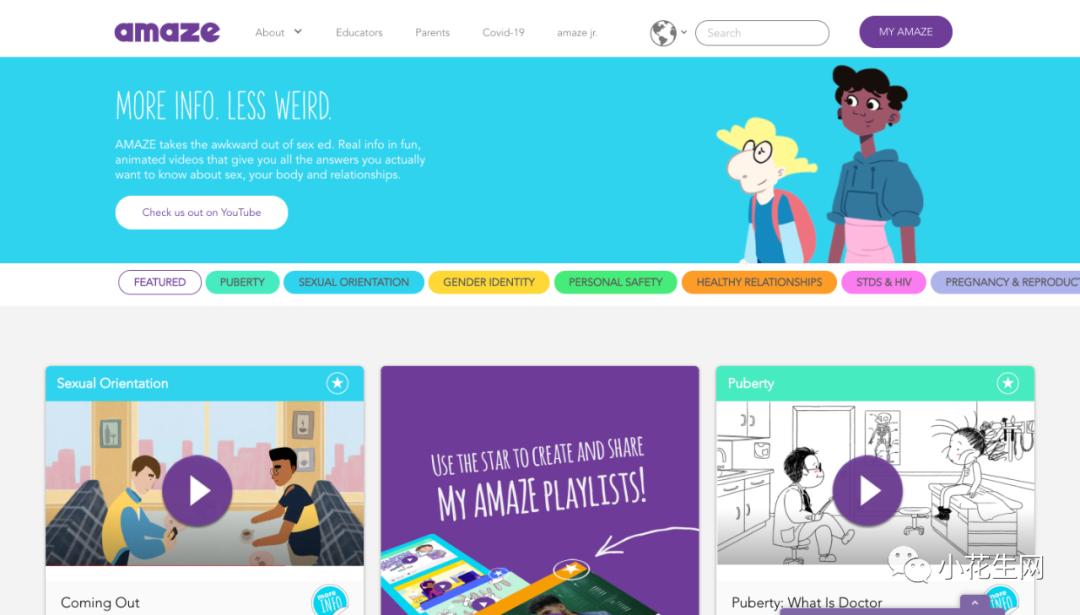 AMAZE 是专做性教育动画的一个组织,月经、乳房发育、青少年性行为、防范性侵危险、是否可以手淫和看动作片、如何看待变性人等家长和青少年关心的话题都有。