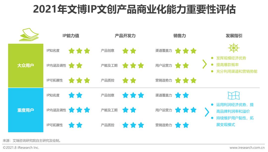 如今文创行业的竞争已经由点到面,不再仅局限于单一产业链维度,而也要从IP实力、产品开发、销售等三个维度进行考虑和评估。从故宫文创到考古盲盒,文博IP文创产品受众从垂直细分人群开始向更广大文化用户渗透,但因两类用户对IP和产品的认知、需求、消费行为的差异化,从而为行业玩家提供两类商业化发展策略,两种发展策略在三个维度上的评估指标也略有不同。总结来说,定位大众用户的文创产品可以重点打造规模经济优势、提高爆款概率,充分利用渠道和营销势能;而定位细分用户的文创产品则可以重点发展利润经济优势,提高品牌利润率和溢价,持续维护用户黏性,拓展变现模式。