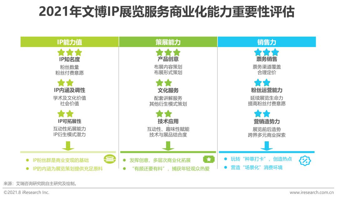 展览的商业化运营能够有效为文博产业健康发展注入资金支持,如今随着年轻一代逐渐成为文博展览的主力和新生力量,文博展览服务也需要转变运营思路,以年轻化心态实现优质展览内容、服务和商业化的有机结合。评估展览服务主要可以从文博IP、策展开发和展览商业化三个方面,包括重点评估文博IP的粉丝力,策展创意及商业化结合度,展览是否“有颜还要有料”,以及对于票务销售及热点营销等商业化运营能力。