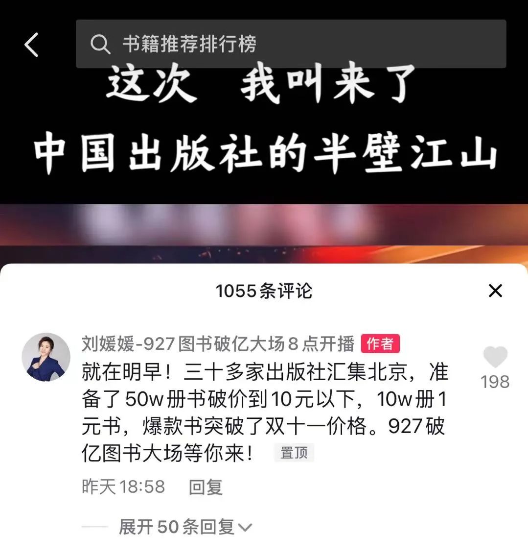 9月27日,刘媛媛开启了亿元专场的直播,号称“喊来了中国出版社的半壁江山”,并在预告中标明“准备了50万册书破价到10元以下,10万册1元的书,爆款书突破了双十一价格。”