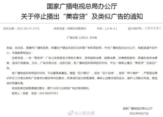 广电总局决定,自即日起,各广播电视和网络视听机构、平台一律停止播出“美容贷”及类似广告。