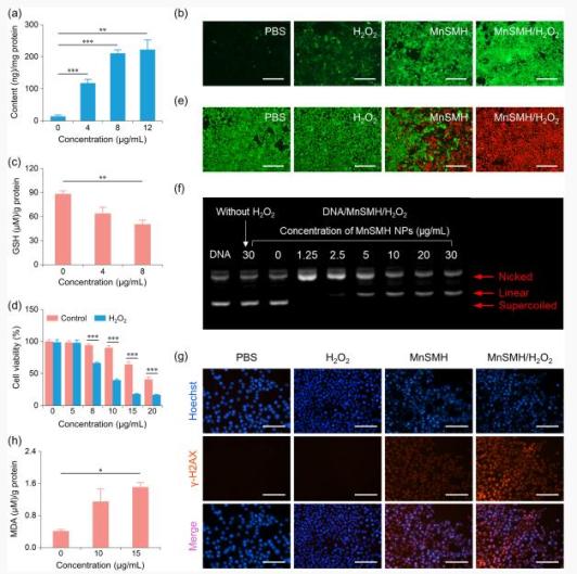 随后,将MnSMH NPs以4T1细胞孵育后发现纳米颗粒可以有效地被细胞所摄取,并且在细胞水平能够检测到明显的ROS产生以及GSH的消耗。进一步的细胞毒性实验证实了MnSMH NPs具备高效杀伤4T1细胞的能力。通过探索ROS诱导细胞死亡的机制,研究人员证实了ROS是通过诱导DNA的损伤和脂质过氧化来实现对肿瘤细胞的杀伤(图2)。