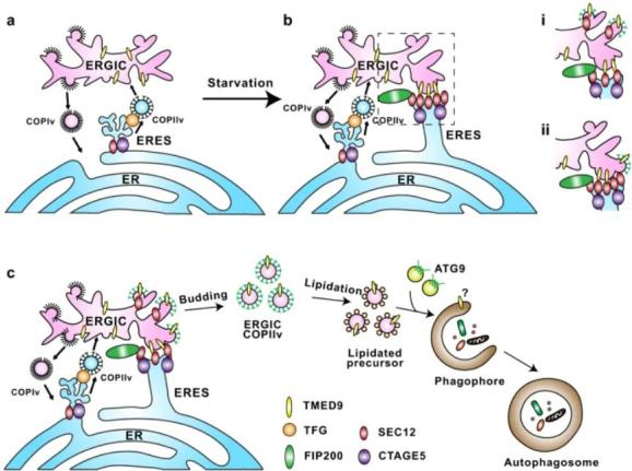 ERGIC-ERES 接触是通过 TMED9 和 SEC12 之间的相互作用建立的,这在两个隔室之间产生短距离对立(接近 2-5 nm)。紧密的膜接触允许位于 ERES 的 SEC12 激活 ERGIC 上的 COPII 组件。此外,SEC12 的一部分也迁移到 ERGIC。通过这两种机制,ERGIC-ERES 接触促进了 ERGIC 衍生的 COPII 囊泡的形成,COPII 囊泡是自噬体的膜前体。ERGIC-ERES 接触在物理和功能上不同于参与分泌蛋白转运的 TFG 介导的 ERGIC-ERES 连接,因此定义了一种独特的内膜结构,在胁迫条件下产生自噬膜形成。