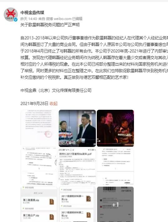 【著名歌星韩磊被曝涉嫌税务问题】9月28日,中视金鼎(北京)文化传媒有限责任公司在社交媒体发布声明称,发现公司在代理著名歌手韩磊经纪业务期间,韩磊存在着大量少交或者漏交与其收入相对应的个人所得税的现象。