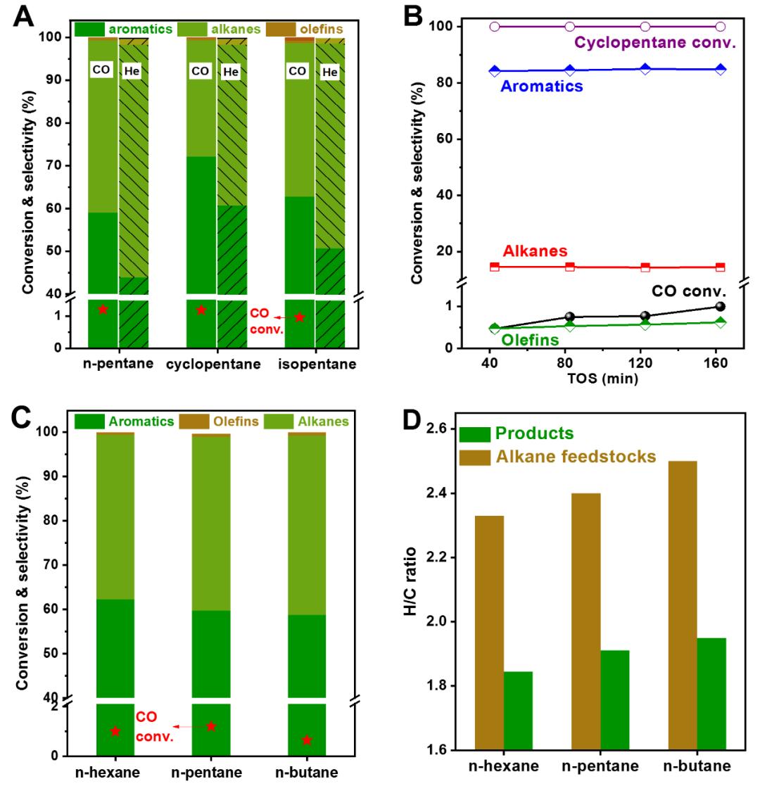 作者首先对不同轻质烷烃的耦合反应进行了研究(图1)。可以看出CO的引入显著提升了反应对芳烃的选择性,且通过进一步的反应优化,环戊烷与CO偶联的芳烃选择性高达85%。