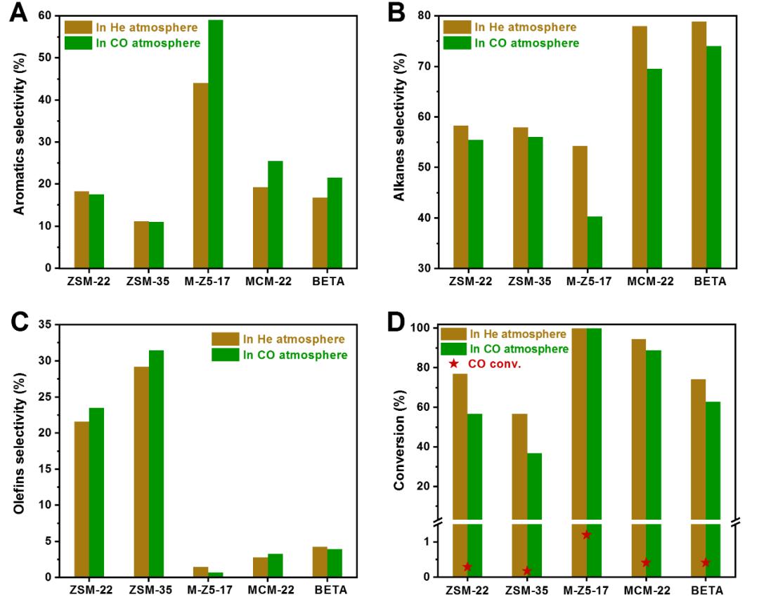 图1:在He以及CO气氛中,不同轻质烷烃的催化转化性能。沸石拓扑结构对正戊烷与CO耦合转化的影响
