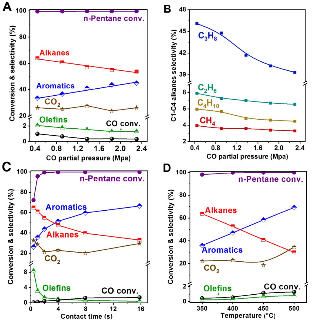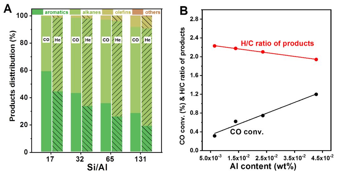在此基础上,作者又研究了一系列不同硅铝比的H-ZSM-5沸石对反应的影响。随着硅铝比从17增加到131,正戊烷转化的芳香选择性显著降低,烷烃选择性显著增加,且CO转化率随着沸石中铝含量的增加几乎呈线性增加,表明CO转化率强烈依赖于沸石的酸性位点(图3)。