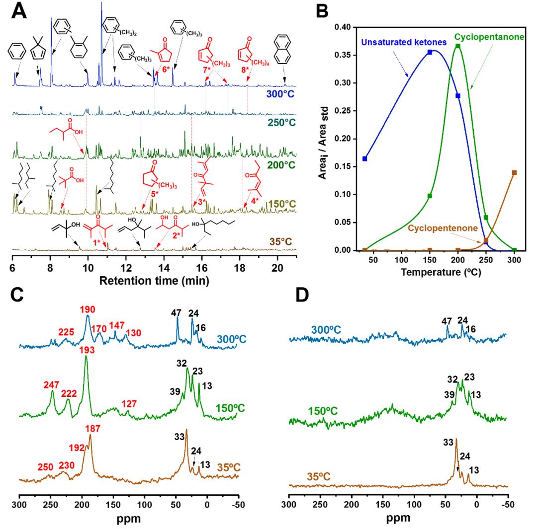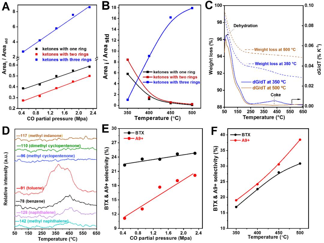 为进一步探究反应机理,作者用GC-MS对催化剂使用后其保留的物质种类进行了鉴定。作者发现除芳香烃外,催化剂上还存在大量的含氧化合物,主要为三种具有不同环数的酮类化合物(图5)。