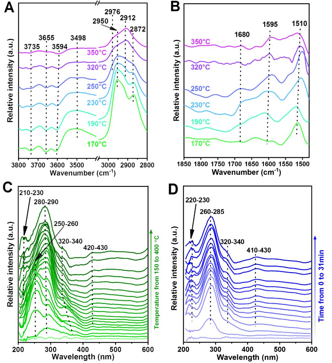 图7所示为不同温度以及时间下的原位光谱,进一步证实了CO可以插入烷烃生成的碳正离子并最终生成芳香烃。此外,随着反应温度以及时间的增加,不饱和醛/酮的峰逐渐形成,这与GC-MS的结果相一致。