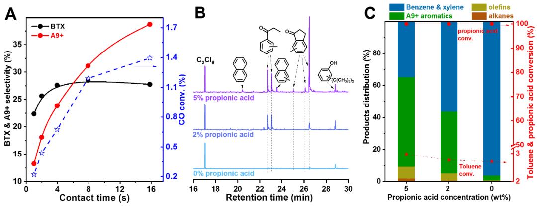 示意图1:甲基取代环戊烯酮在H-ZSM-5上的形成机制。正戊烷与CO偶合转换的另一个重要特征是A9+芳香选择性随着接触时间的增加而急剧增加,而BTX选择性在长时间后则会降低,这意味着BTX可以进一步转化为A9+芳烃。此外,随着接触时间的延长,CO的转化率仍在不断增加,这表明CO可能参与了BTX向A9+芳烃的转化。根据前文提出的机理,可以进一步扩展到酰阳离子与BTX反应生成A9+芳烃。为了验证这一推测,作者以甲苯与丙酸为模型进行了验证实验(图9),证实了酰阳离子可以与芳烃反应,并提出了反应路径(示意图2)。