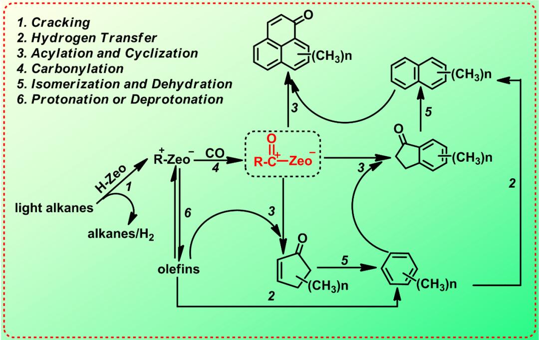 基于上述研究结果,作者提出了一个可能的耦合反应机理(图10)。不同的轻质烷烃可能产生不同活性的碳正离子,由此进一步影响羰基化和氢转移反应,并最终产生不同的产物分布。