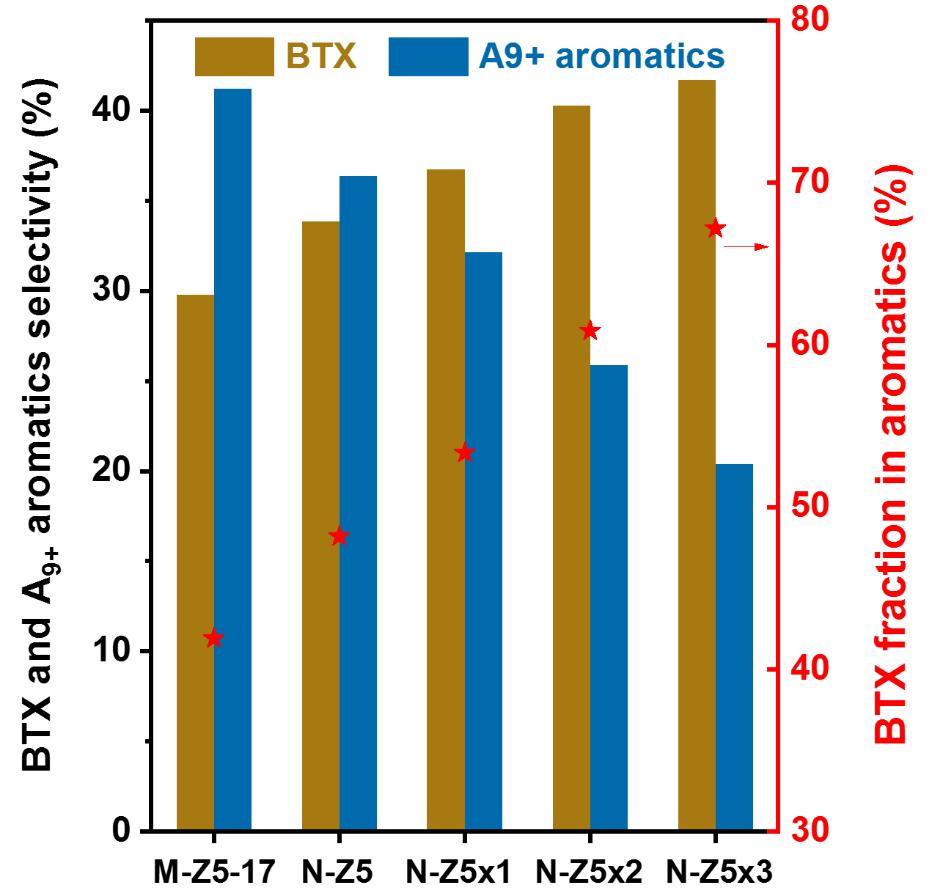 根据上述机理,提高BTX选择性的关键是减少其二次反应。因此,作者使用H-ZSM-5的一个小晶体增强了BTX的扩散,并钝化H-ZSM-5的外表面酸度阻碍了BTX在外表面的转化。从图11可以看出,在纳米尺寸的ZSM-5上,BTX的选择性增加,而总芳香选择性保持71%。经TEOS修饰后,BTX组分逐渐增加,选择性提高到41.7%。