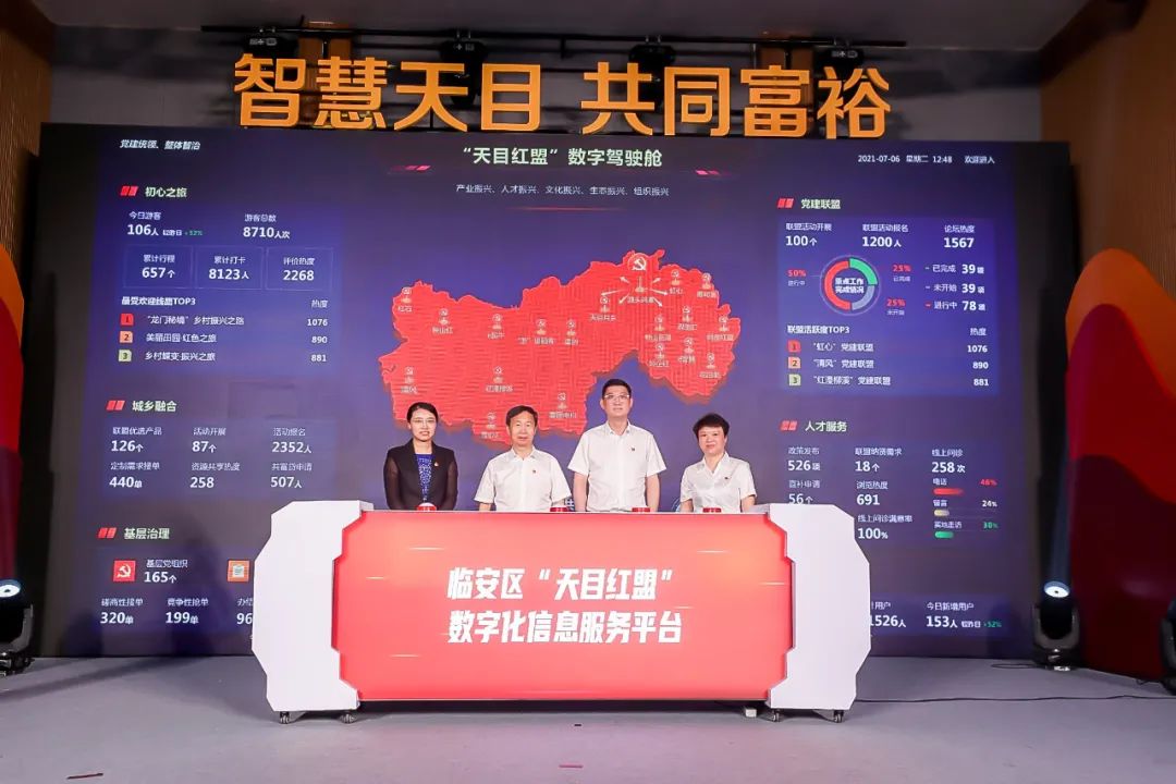 天目红盟发布会。线上+线下,谋划“红盟”最优顶层设计。搭好线下组织框架。立足区、镇、村、校、企五方共建,着力构架“天目红盟”1+N+X组织框架,由一个召集核心,N个既定党组织,若干个可增减的企事业单位、院校和社会组织等构成。目前18个镇街和青山湖科技城已建区域牵引型党建联盟19个,同步建设示范带19条,共整合87个村(社区)、42个职能部门、23所科研院校、71家企业、142家经济和社会组织。开发线上数字平台。聚焦“党建统领类应用场景”开发,突出“组织为乡村振兴和共同富裕背书”,创新打造“天目红盟”数字化平台,开发“初心之旅一张图”“组团发展一联盟”“城乡融合一社区”“乡村人才一智库”“基层治理一管家”5个互联互融应用场景,平台目前已在杭州城市大脑和天目先锋上线,入选杭州市“数智组工”区县市矩阵。