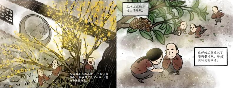 《从百草园到三味书屋》是鲁迅于1926年写的一篇回忆其童年妙趣生活的散文。百草园,以“乐”为中心,简约生动的描绘了一个奇趣无穷的儿童乐园,动静结合,趣味无穷;三味书屋则是一个完全不同的世界,是“全城中最严厉的书塾”,儿童在那里受到规矩的束缚。本书的绘者并未将三味书屋刻画得死气沉沉,而是通过课间到后园嬉耍,老私塾先生在课堂上入神读书学生乘机偷乐两个小故事的叙述,使三味书屋充满了谐趣,表现了儿童不可压抑的快乐天性。