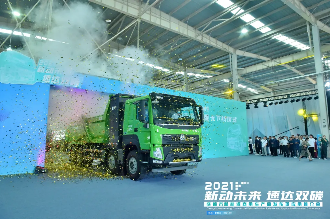 9月7日,成都新能源商用车产品发布及应用推介会在青白江中国重汽集团成都商用车制造基地(简称“重汽成商”)举办,在无数飘舞的彩条搭配上灯光和舞台烟雾的热闹氛围中,一辆新能源重型卡车徐徐滑入会场,标志着重汽成商最新生产的新能源重卡正式下线。而就在当日,总投资约为50亿元的国家电投换电重卡项目,先期启动的四川首座智能充换电站也在青白江正式投入运营。