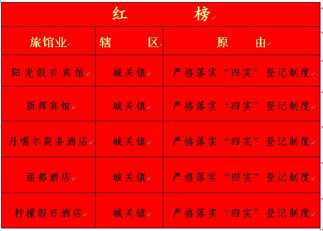 为有效督促辖区特种行业业主落实各项工作规定,严格履行“四实”制度,持续推进落实旅店业接待未成年人入住“五必须”要求,确保旅店业规范、依法经营,有效预防、控制和打击违法犯罪活动,县公安局治安管理大队联合派出所对辖区旅店业进行了详细的检查。现将我县2021年第三季度旅馆业管理情况以“红黑榜”形式进行通报,鼓励红榜,鞭策黑榜。