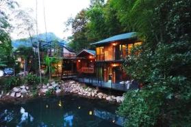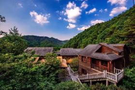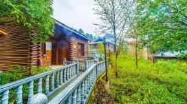 坐落于神丽峡景区门口,木屋星罗棋布地分布于山底下,四周绿树青山环绕,繁花点缀其间,开帘即是翠绿,与山林气息融为一体。