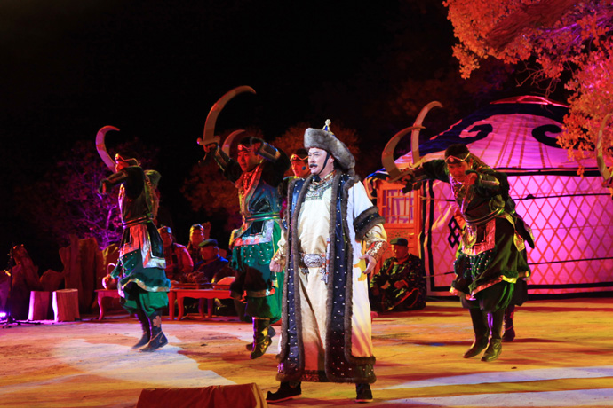”阿拉腾陶来”意为金色胡杨。大型实景音乐剧《阿拉腾陶来》,以额济纳的千年胡杨林为背景,采用了蒙古民族歌舞与美国百老汇音乐剧相结合的创新表演形式,展现了额济纳地区的发展历程和动人故事,以独特巧妙的舞台呈现,达到实景+科技”“旅游+演艺”的高度文旅融合的效果,该剧融入了陶布秀尔、萨吾尔登、马头琴、呼麦、长调民歌等蒙古族非物质文化遗产表演形式,是一场极具视觉、听觉冲击力的文化盛宴。借喻千年不朽的胡杨,讲述额济纳三千年的历史故事,抒发了感人至深的爱国主义情怀和无私奉献的民族精神。