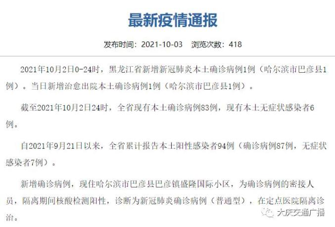 大庆市防疫指挥部紧急提示!黑龙江省新增本土1例!省阳性感染者轨迹汇总信息公布!