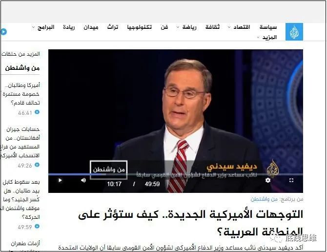 卡塔尔半岛电视台的《华盛顿视角》是面对阿拉伯民众的阿语谈话栏目,7月30日的《美国的新趋势如何影响阿拉伯地区》一期里,嘉宾之一“美国国防部国家安全事务副助理部长戴维·悉尼(David Sydney)证实,美国决定从阿富汗、伊拉克和它认为不太重要的地区撤军,以便重点关注中国和俄罗斯”。