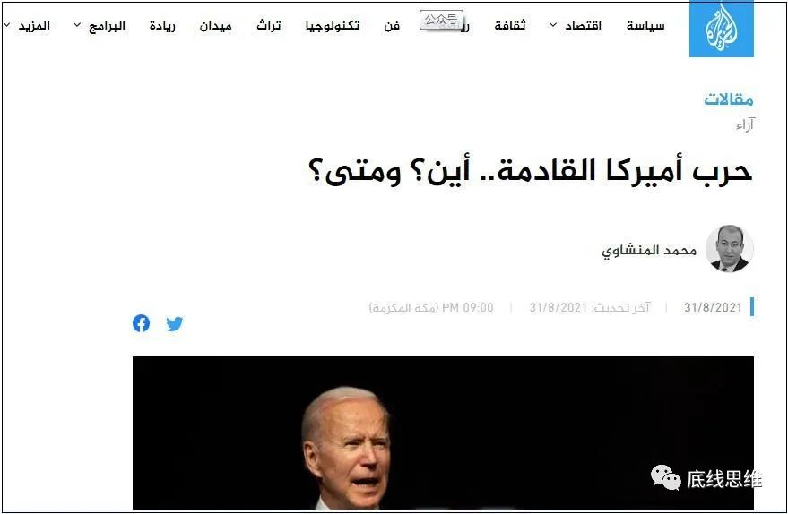 8月31日,政治分析家阿尔曼沙维在半岛官网发表文章《美国的下一场战争,在哪里,在何时?》指出,美国自有一种行为逻辑,经历了韩战、越战的失败之后,她的第一反应都是尽快再打一仗,试图通过赢得新的战争胜利,抵消上一次失败的信誉损失,重新确立威权地位。按此规律,美国很可能借台湾问题,在南海对中国启动战端。
