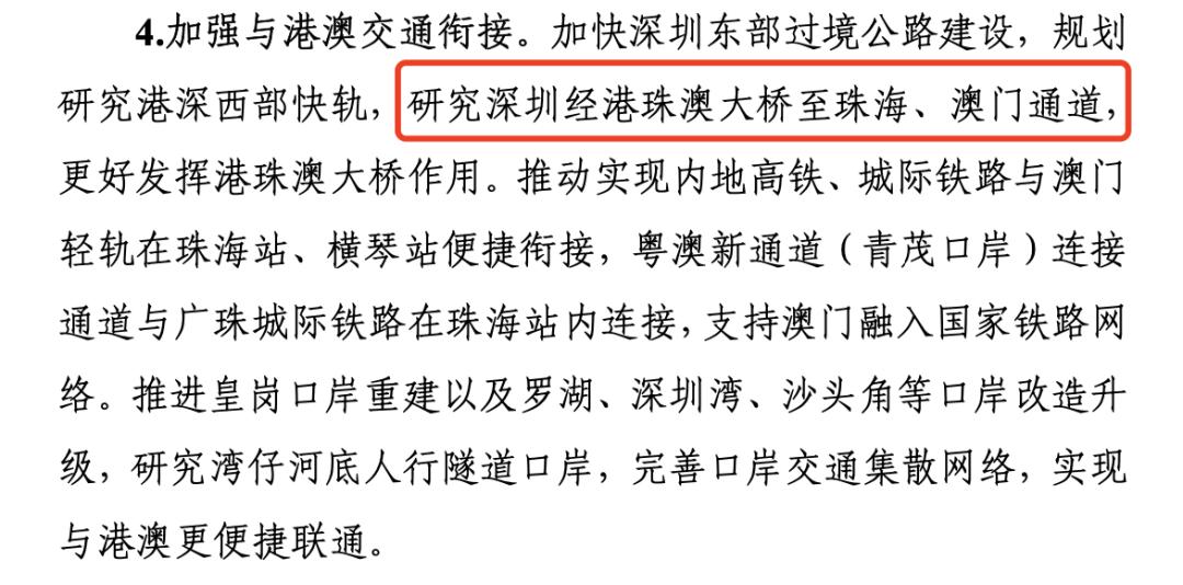 根据《规划》,广东将“研究深圳经港珠澳大桥至珠海、澳门通道,更好发挥港珠澳大桥作用”。