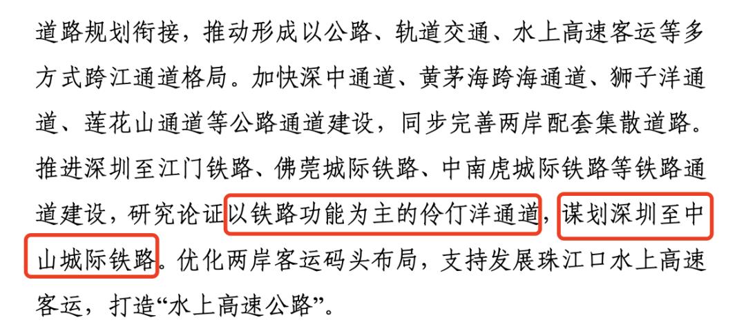 “谋划深圳至中山城际铁路”,这将弥补“深中通道”只能走汽车而不能走火车的缺憾。