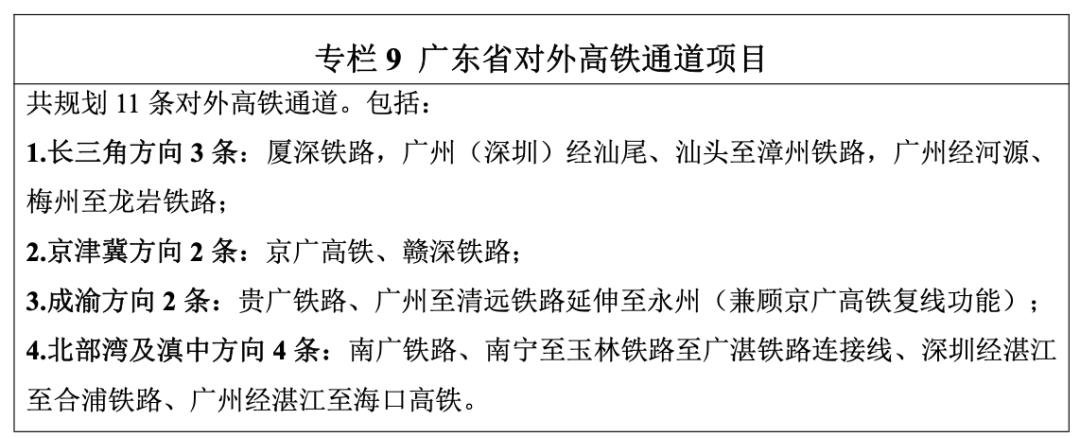 《规划》还提到,要高标准建设广州经汕头至漳州、广州经湛江至海口(合浦)、深圳至深汕合作区等高铁线路,推动形成沿海高速铁路双通道。加快建设赣州至深圳铁路,规划广州至清远铁路延伸至永州、广湛高铁与深南高铁茂名至岑溪连接线,开展广州至河源高铁前期研究。